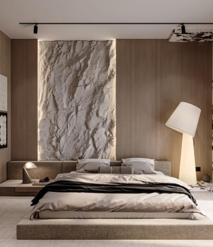 Penerapan PU Stone dalam Kamar Tidur: Dinding Beraksen PU Stone: Gunakan PU Stone sebagai aksen dinding di area kepala tempat tidur. Pilihan tekstur batu alami seperti batu bata yang kasar atau marmer yang elegan dapat memberikan sentuhan yang alam dan modern pada kamar tidur. Keunggulan PU Stone dalam Desain Interior: