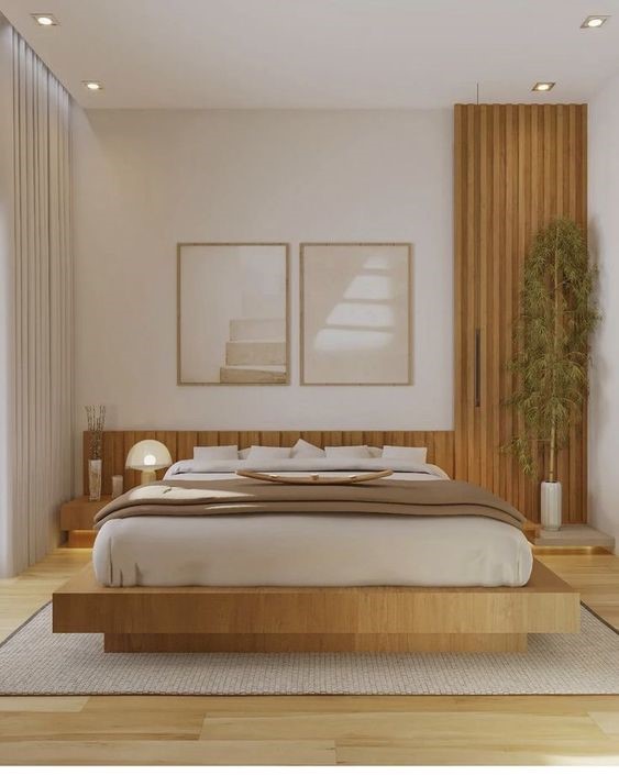 Konsep Japandi didominasikan dengan motif kayu alami. Dengan menggunakan konsep Japandi Modern ini pada kamar tidur kalian, akan membuat nyaman dan memanjakan mata karena memberian kesan clean dan warm. Kalian dapat memasang WPC di dekat kasur kalian seperti pada gambar.