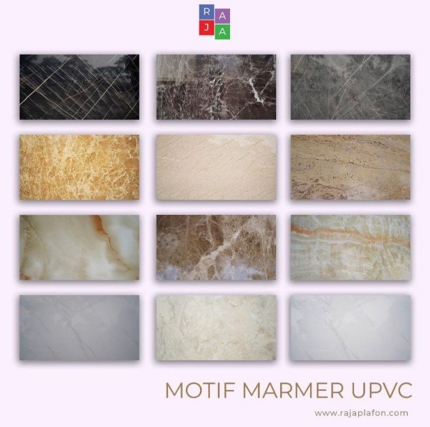 Marmer UPVC paling sering digunakan untuk dinding ruangan, karena terbuat dari lembaran PVC yang berkualitas tinggi, Lembaran PVC yang dicetak dengan motif marmer dan dilapisi coating anti starch, Marmer UPVC ini memiliki ukuran panjang 244cm, lebar 122cm, tebal 3mm.