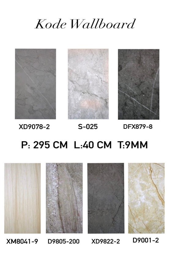 Kalian juga bisa memadukan cover dinding wallboard ini menggunakan WPC , Seperti inspirasi diatas Pemasangan wallboard ini menggunakan lem sealant, walaupun wallboard kokoh namun kalian dapat memotong wallboard dengan cutter atau gerinda jika ingin di sesuaikan dengan ruangan. Dinding yang tadi nya banyak noda, retak dan lembab dapat di atasi dengan Wallboard PVC ini. Sini kami spill motif-motif Wallboard PVC