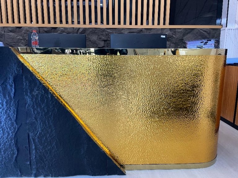 Wallboard motif JS09 sebagai bahan nya karena memiliki motif dan warna yang unik dan juga membuat terlihat mewah dengan warna emas nya yang berkilau. Tapi kalian bisa menyesuaikan motif wallboard dengan ruangan yang kalian punya karena wallboard memiliki beragam motif. Wallboard bamboo di pasang menggunakan lem sika. Kita juga jual lem nya lohh.