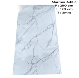 Marmer Upvc A43-1, adalah sebuah marmer upvc yang mempunyai ukuran panjang 290 cm, lebar 120 cm , dan tebal 3 mm. Dengan warna dasar putih dengan motif corak abu abu yang simple dan elegan menambah ke estetik an marmer upvc ini.