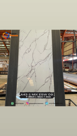 Marmer Esmr adalah sebuah produk dinding dengan panjang 290 cm, lebar 120 cm dan tebal 3 mm. Dan salah sau produk yang paling banyak diminati adalah produk marmer esmr A43-1, dengan motif elegan yang menghubungkan kombinasi antara warna putih, dan abu-abu beraksen dengan corak beragam.